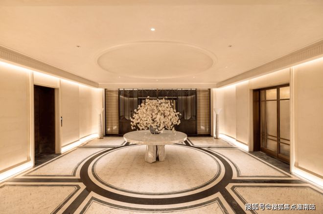 为主调,镶嵌典藏级老虎玉大理石, 点缀古铜色现代海派艺术感灯器,整体呈现出百年海派的贵雅气质。 在门庭的环岛空间,景墙面采用中轴对称的设计布局,定制了奢石镶嵌装饰,将曲面艺术与经典石器之美圆融交融。 预接待厅地面瓷砖采用威尼斯白与爵士白石材拼花设 计,纯人工铺装保证花纹的奢华质感。