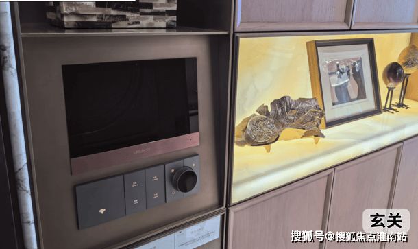 ,质感厚重;通顶玄关柜,内置消毒精灵,奢石把手+奢石台面更显海派温润气质,玄关地面都铺上了海上·清和玺的logo拼花,小小玄关做到了既实用又美观。