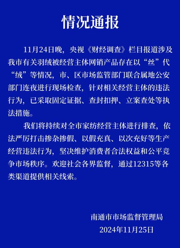 11月25日,江苏省南通市市场监督管理局发布一则情况通报称,11月24日晚,央视《财经调查》栏目报道涉及南通市有关羽绒被经营主体网销产品存在以“丝”代“绒”等情况,市、区市场监管部门联合属地公安部门连夜进行现场检查,针对相关经营主体的违法行为,已采取固定证据、查封扣押、立案查处等执法措施。